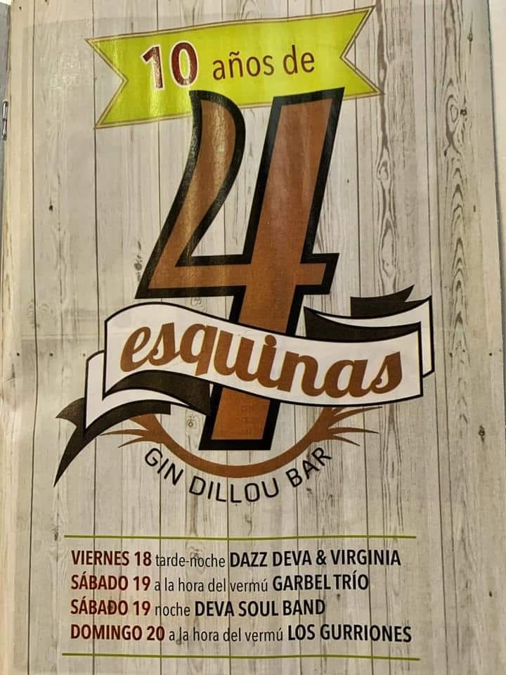 El décimo aniversario de las 4 Esquinas se completará con una actuación, el sábado, a la hora del vermut, de Garbel Trío y por la noche, de la Deva Soul Band. Cerrarán este ciclo, el domingo, a la hora del vermut, Los Gorriones.