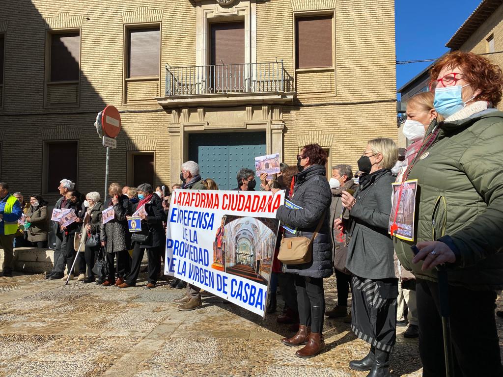 Bajo el grito "lo que ha pagado el pueblo, que sea para el pueblo" un centenar de vecinos de Ayerbe y alrededores se concentraban este domingo a las puertas del Obispado de Huesca para reivindicar que la Ermita Virgen de Casbas es del pueblo y no de la Iglesia. Aseguran que han invertido más de 600.000 euros en su arreglo en los últimos años. "De no ser por nosotros, los vecinos, la existiría litigio porque la ermita estaría en ruinas", sostenía José Luis Gállego, portavoz en el Ayuntamiento de Ayerbe.