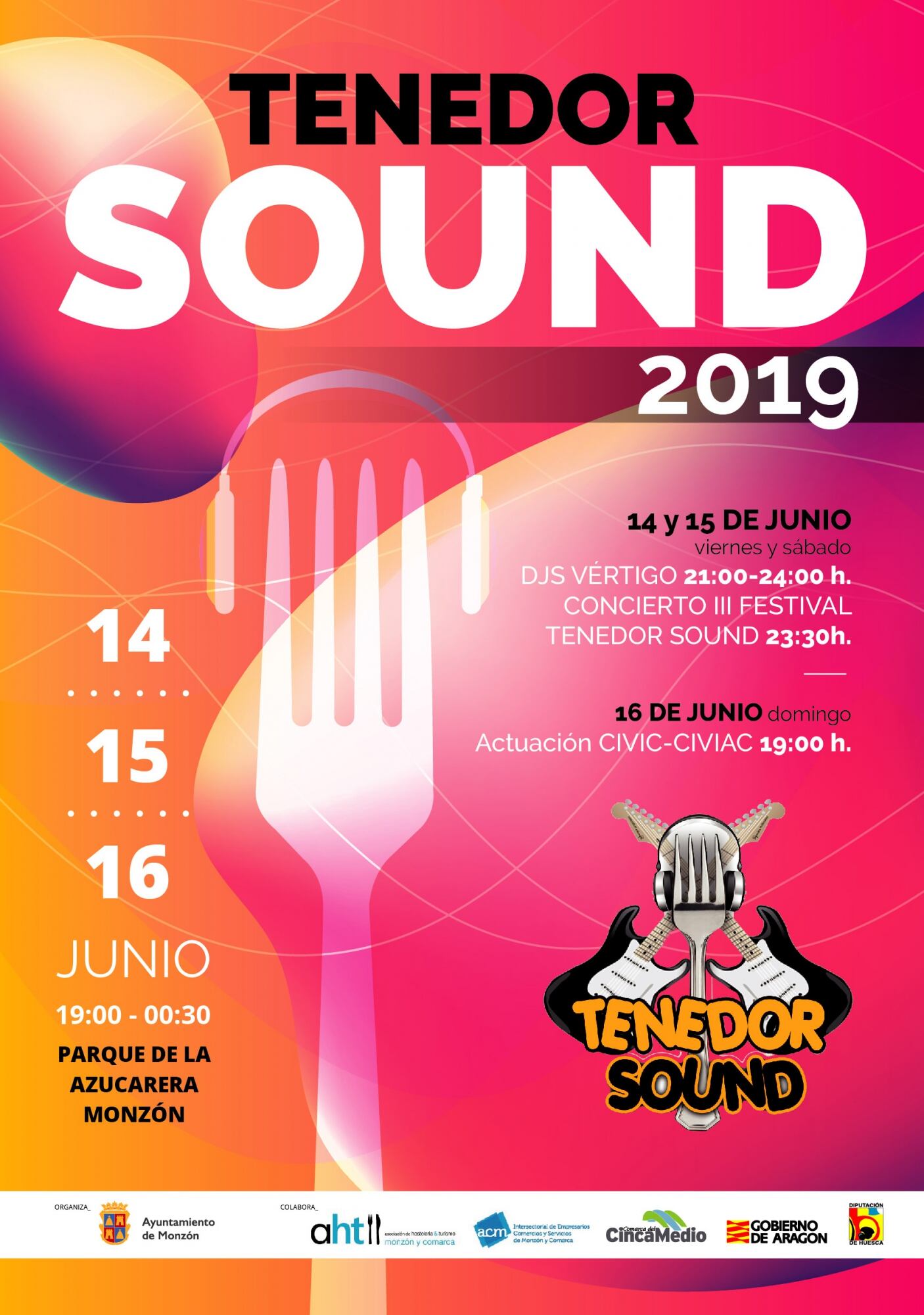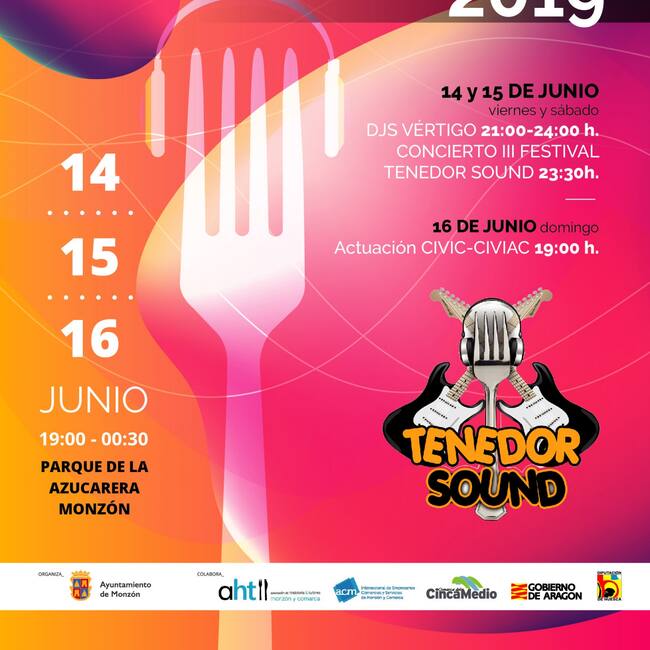 La Concejalía de Desarrollo del Ayuntamiento de Monzón ultima el programa de la sexta edición del Tenedor Sound, el festival de tapas y música que se celebrará en el parque de la Azucarera del 14 al 16 de junio. Si de la parte gastronómica se encargan los restaurantes de la ciudad y la comarca, la musical correrá a cargo de djs Vértigo, el viernes y el sábado, y la animación de Civi Civiac, el domingo. A partir de medianoche la fiesta se trasladará al recinto del Espacio Joven con el III Tenedor Sound Festival.