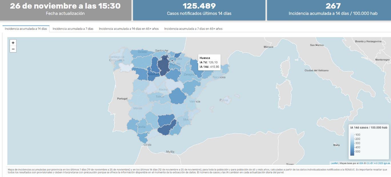Hay que recordar que, del 22 de octubre al 4 de noviembre, Huesca se situaba en cabeza con 1.164,38 casos por cada 100.000 habitantes. Y del 29 de octubre al 4 de noviembre la situación no había mejorado y la de Huesca seguía siendo la provincia más afectada, con 509,84 casos.