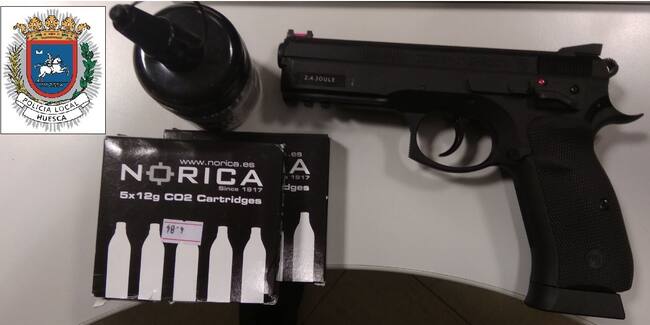 En la misma actuación y tras proceder al registro del vehículo y del individuo se localizó en el maletero, de modo oculto, un arma corta de la aire comprimido con munición sin ningún tipo de documentación. Dicha arma representa una réplica exacta de su original de fuego. La misma fue incautada y trasladada hasta dependencias de Policía Local, iniciándose el procedimiento reglamentario.