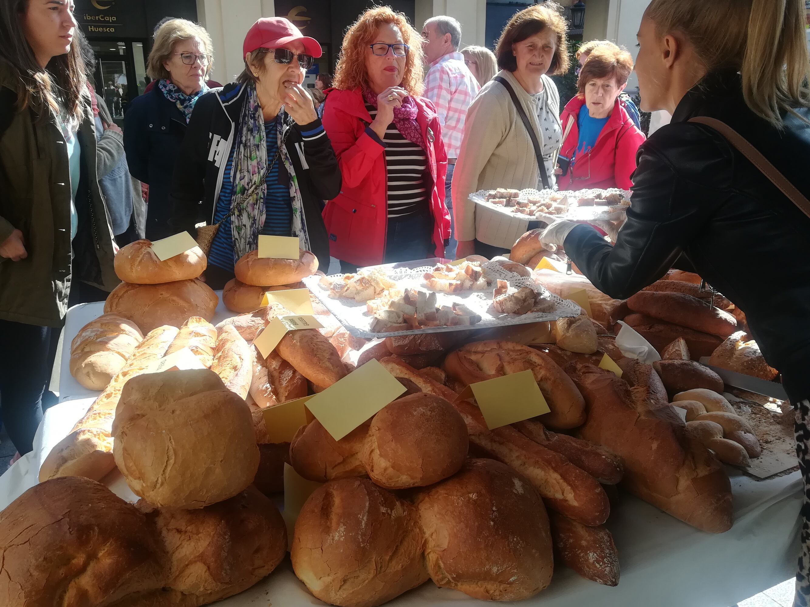 Las panaderías asociadas de Huesca ofrecían a los viandantes la oportunidad de degustar su producto, acompañado de una exposición de las diferentes variedades de pan y, además, se sorteaba el consumo gratuito de 180 días. Fernando Olivan es su presidente y recuerda que la finalidad de esta jornada es la de concienciar sobre la importancia de este consumo