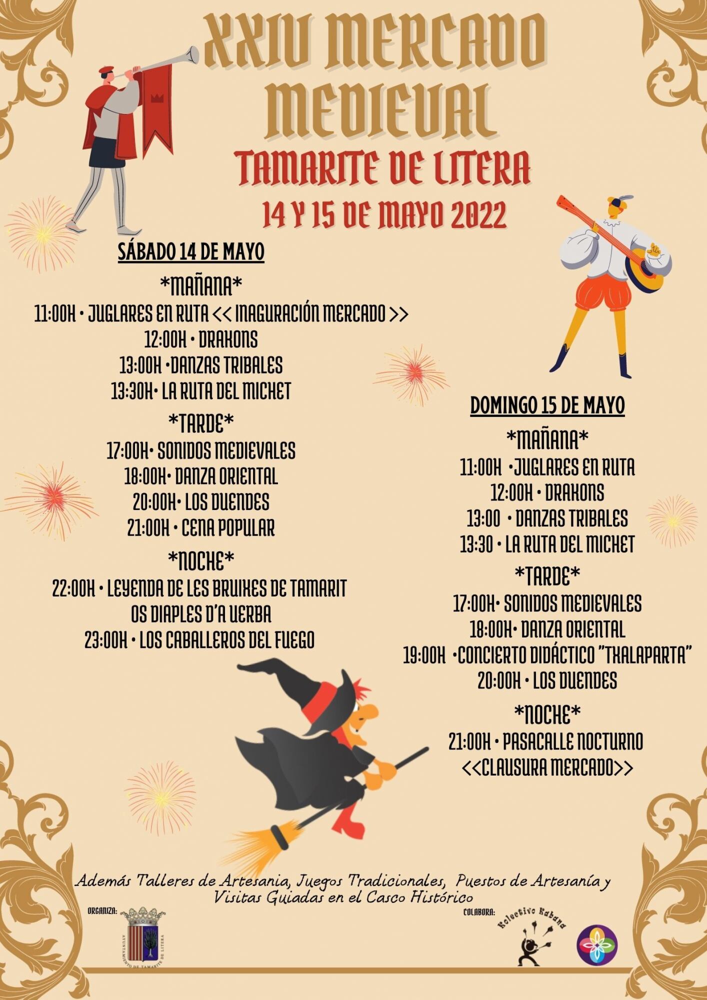 El programa que proponen el Ayuntamiento de Tamarite de Litera, que organiza el mercado, y el Kolectivo Kabana, colaborador principal del evento, cuenta con más de dieciocho actividades culturales y lúdicas a lo largo de los dos días que dura el Mercado Medieval. Los platos más fuertes de esta edición lo componen el espectáculo ”Leyenda de las Bruxas de Tamarite”, a cargo del grupo Os Diaples d'a Uerba, que amenizará la noche del sábado 14 con su representación teatral salpicada con artificios pirotécnicos de baja intensidad, pero de gran efecto visual, manejados por los ‘diaples’, las brujas -jugando con sus bestias- y animados por los músicos en directo con ritmos tradicionales aragoneses y de otras culturas, así como fusionados con otros instrumentos. Esta actuación tendrá lugar a las 22.00 horas, después de la cena popular (21.00 horas) a la que invita el Kolectivo Kabana en el contexto del mercado.