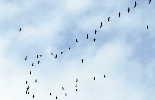 Las grullas, animales muy inteligentes, que incluso llegan a adquirir acentos diferentes en sus sonidos dependiendo de los lugares en los que viven, vuelan siempre en formación en V, la manera más inteligente de volar y la más eficaz a nivel energético. A la cabeza de la formación siempre van los adultos y más experimentados.