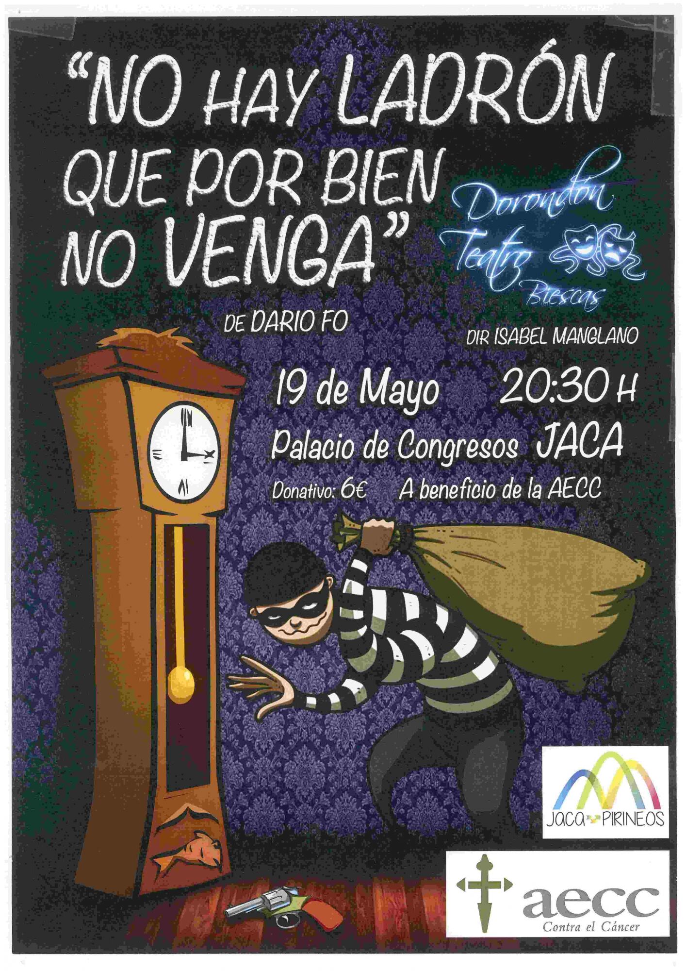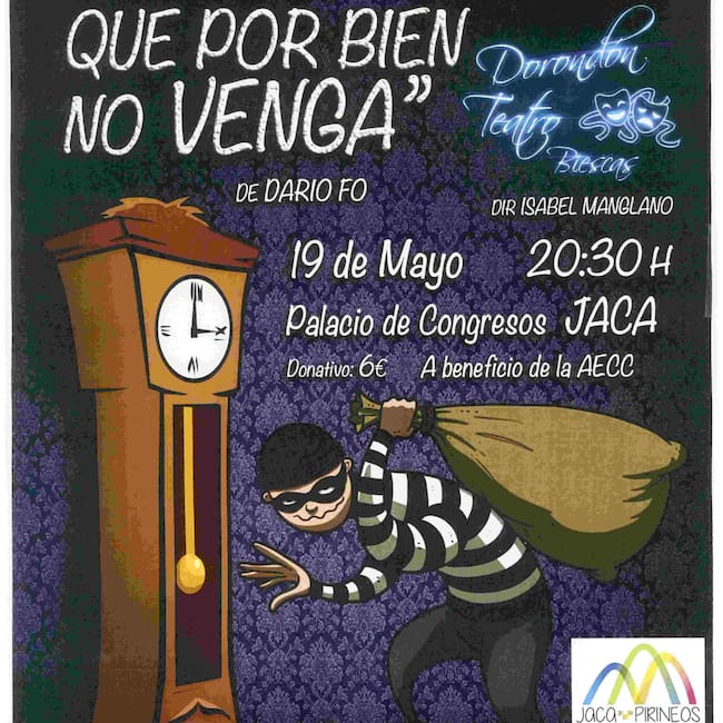 Este sábado la compañía de Biescas Dorondón Teatro vuelve a subir a escena por una causa solidaria. Representan “No hay ladrón que por bien no venga” a beneficio de la Asociación Española Contra el Cáncer en Jaca. La cita es este sábado día 19 a las 20’30 horas. La entrada será un donativo de 6 euros.