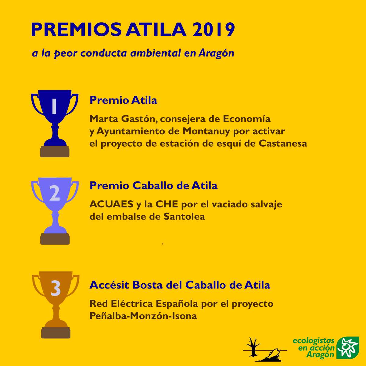 Como cada año, Ecologistas en Acción Aragón otorga simbólicamente los premios Atila con el objetivo de distinguir y denunciar a aquellas personas y entidades que hayan destacado por su contribución a la destrucción del medio ambiente. Con esta distinción, Ecologistas en Acción pretende recompensar los esfuerzos, nunca valorados en su justo término, de aquellas personas que dedican «desinteresadamente» tiempo y trabajo a destruir el medio ambiente.