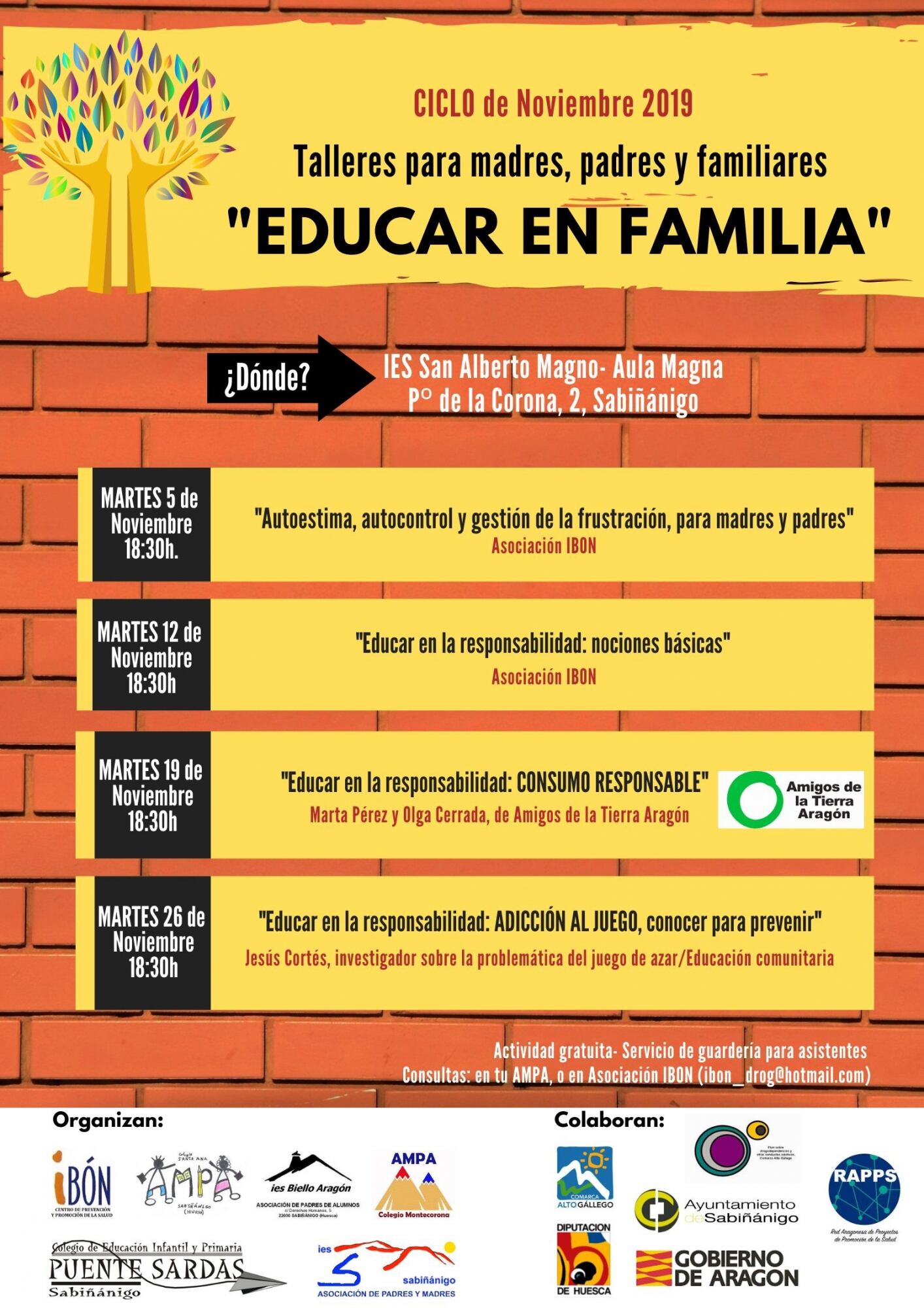 El taller del 19 tendrá por tema “Educar en la responsabilidad: Consumo responsable”, impartido por Marta Pérez y Olga Cerrada, de Amigos de la Tierra Aragón. Y se concluirá el martes 26 con “Educar en la responsabilidad: Adicción al juego, conocer para prevenir”, impartido por Jesús cortés, investigador sobre la problemática del juego de azar y Educación comunitaria.