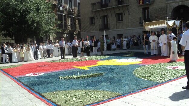 Una quincena de voluntarios se encargaban de confeccionar la alfombra desde las 5.30 de la mañana. Para ello, utilizaban miles de pétalos de color rojo y blanco, así como hierba, tierra y serrín. También se realizaba otra alfombra en la Plaza de Santa María, frente a la catedral. En total, se empleaban 28 sacos de serrín, que se ha ido tiñendo de distintos colores a lo largo de toda la semana.