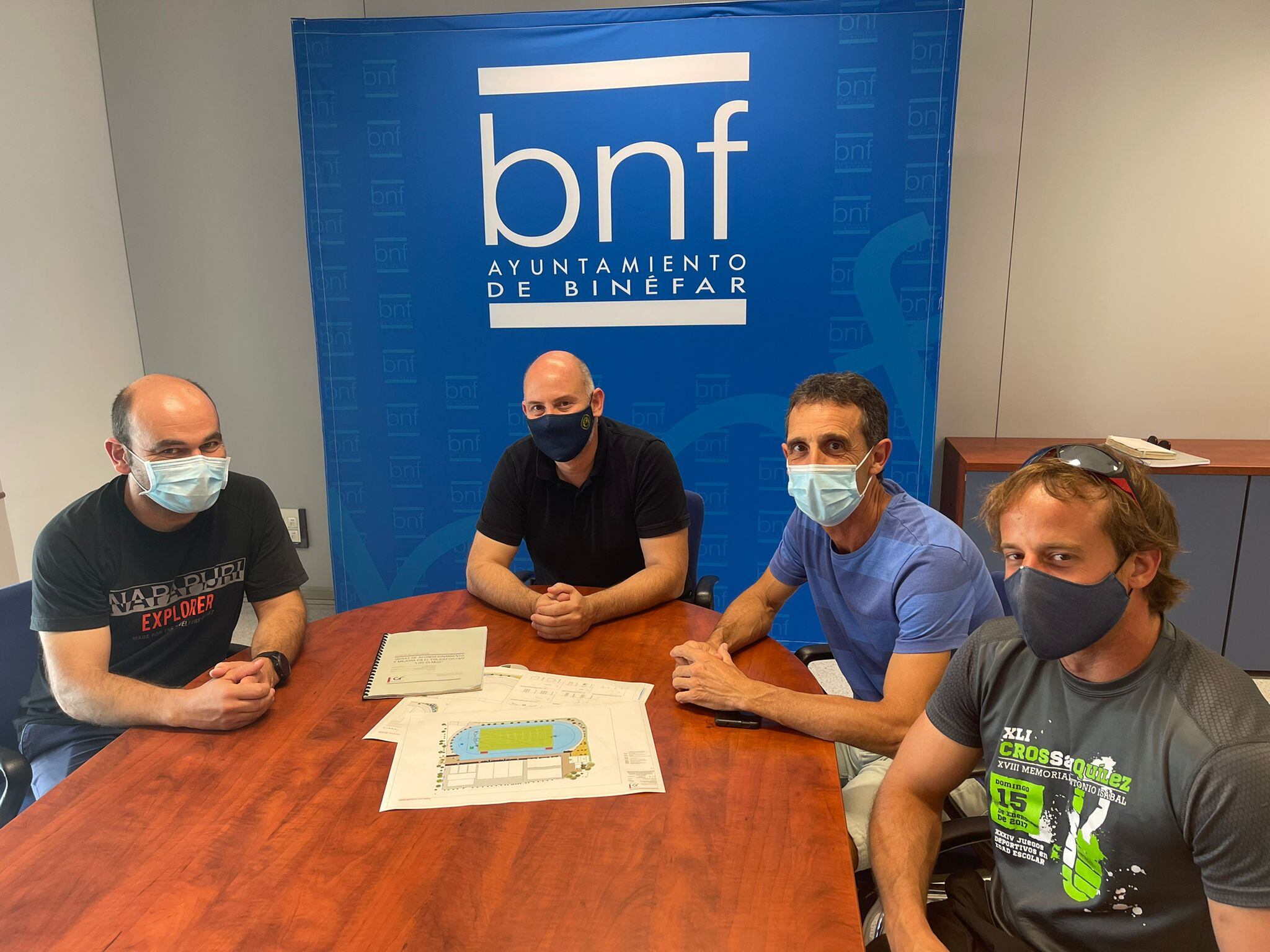 El concejal de Deportes del Ayuntamiento de Binéfar, Juan Carlos García, mantuvo recientemente una reunión con Ricardo de la Fuente, responsable de El Reto de Correr, y Carlos Oriach, presidente del Club Atletismo Binéfar -al que acompañaba el director técnico del club, Alberto Navalón-, y técnicos municipales para analizar con ellos el proyecto de mejora de las pistas polideportivas y su entorno.