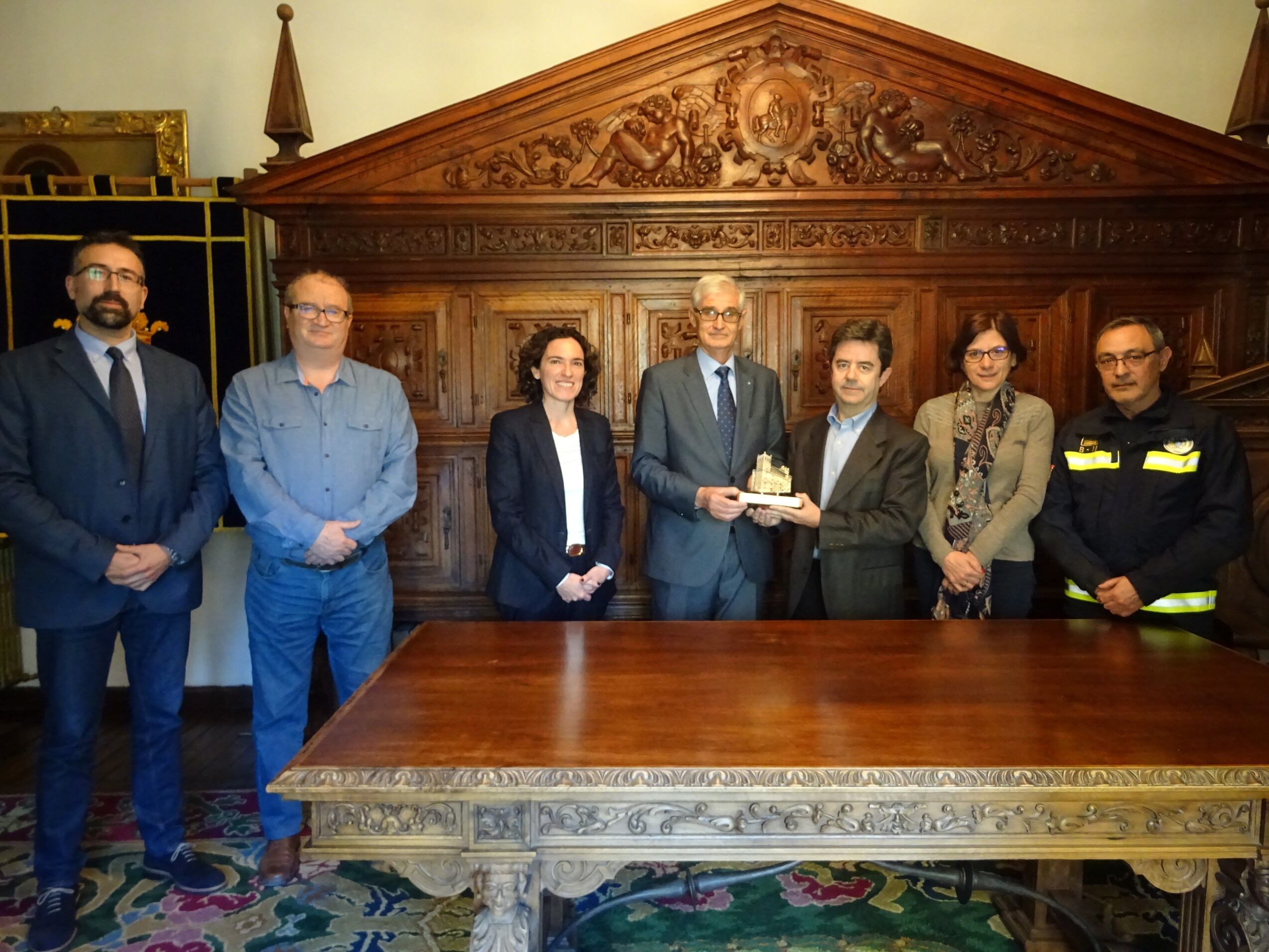 Tras la presentación de la nueva responsable de la Jefatura Provincial de Tráfico, el alcalde ha querido transmitir su gratitud a Andrés Fernández del Río por su trabajo desde ese puesto durante 33 años y el reconocimiento por la colaboración que siempre ha prestado al Ayuntamiento de Huesca, por lo que le ha entregado una reproducción de la fachada de la Casa Consistorial.