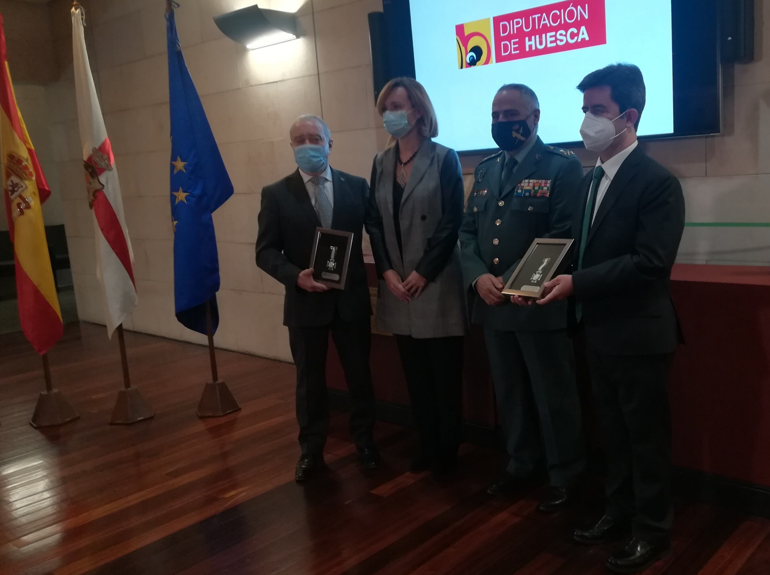 El alcalde de Huesca Luis Felipe y el presidente de la Diputación Provincial de Huesca, Miguel Gracia han recibido la Cruz con distintivo blanco de la Orden al Mérito de la Guardia Civil. Lo hacían de manos del General Jefe de la Zona de Aragón de la Guardia Civil Carlos Crespo que se refería al pasado 12 de octubre, festividad del Pilar, en la que Huesca acogió el 175 aniversario de este cuerpo. Esto formaría parte de los méritos necesarios para recibir esta distinción