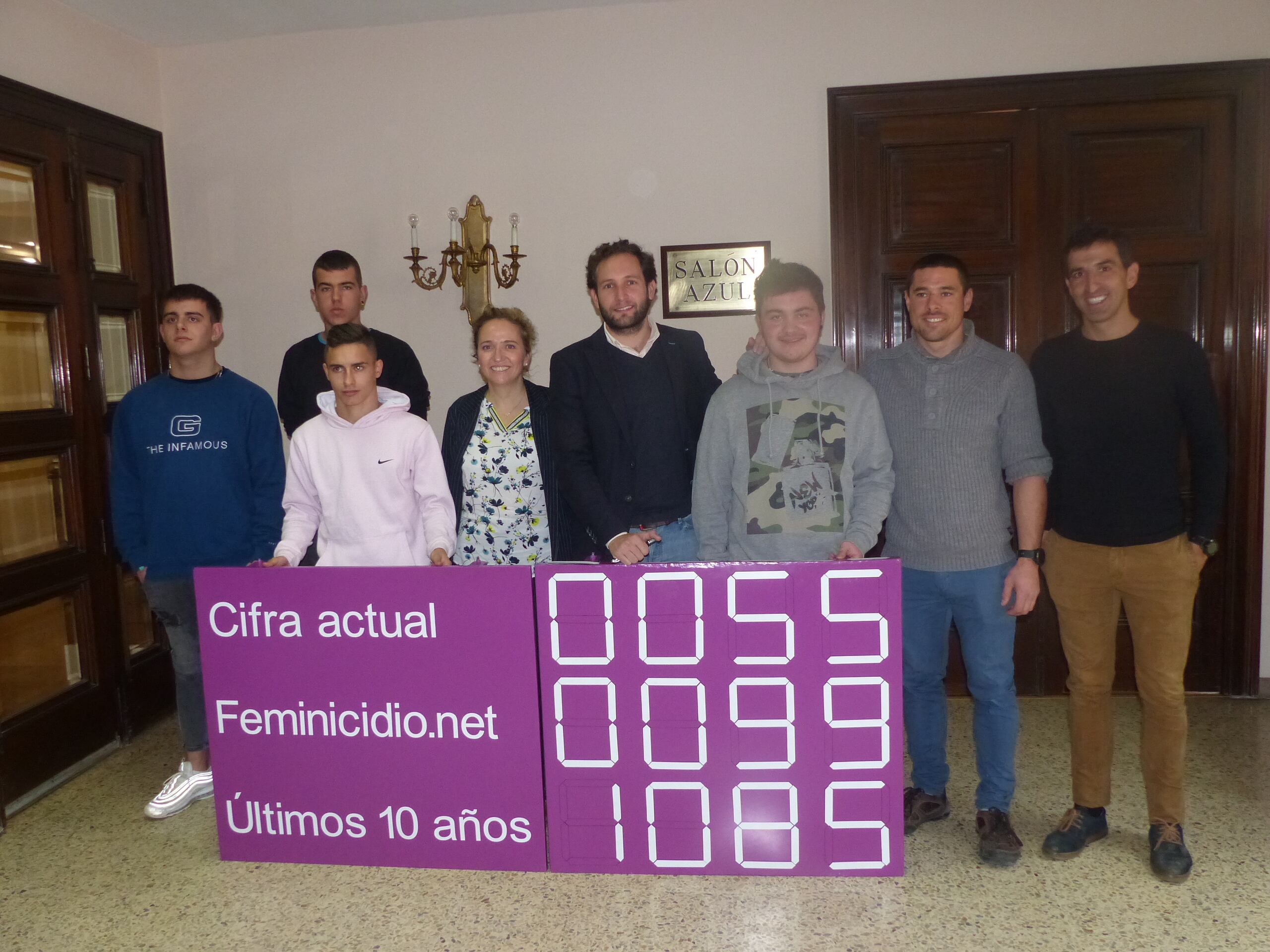 Los alumnos de Formación Profesional Básica del colegio salesiano Santo Domingo Savio de Monzón han hecho entrega este jueves al alcalde, Isaac Claver, y la concejal de Políticas de Igualdad, Marta Montaner, de un contador de víctimas de violencia de género que han fabricado en uno de sus talleres.