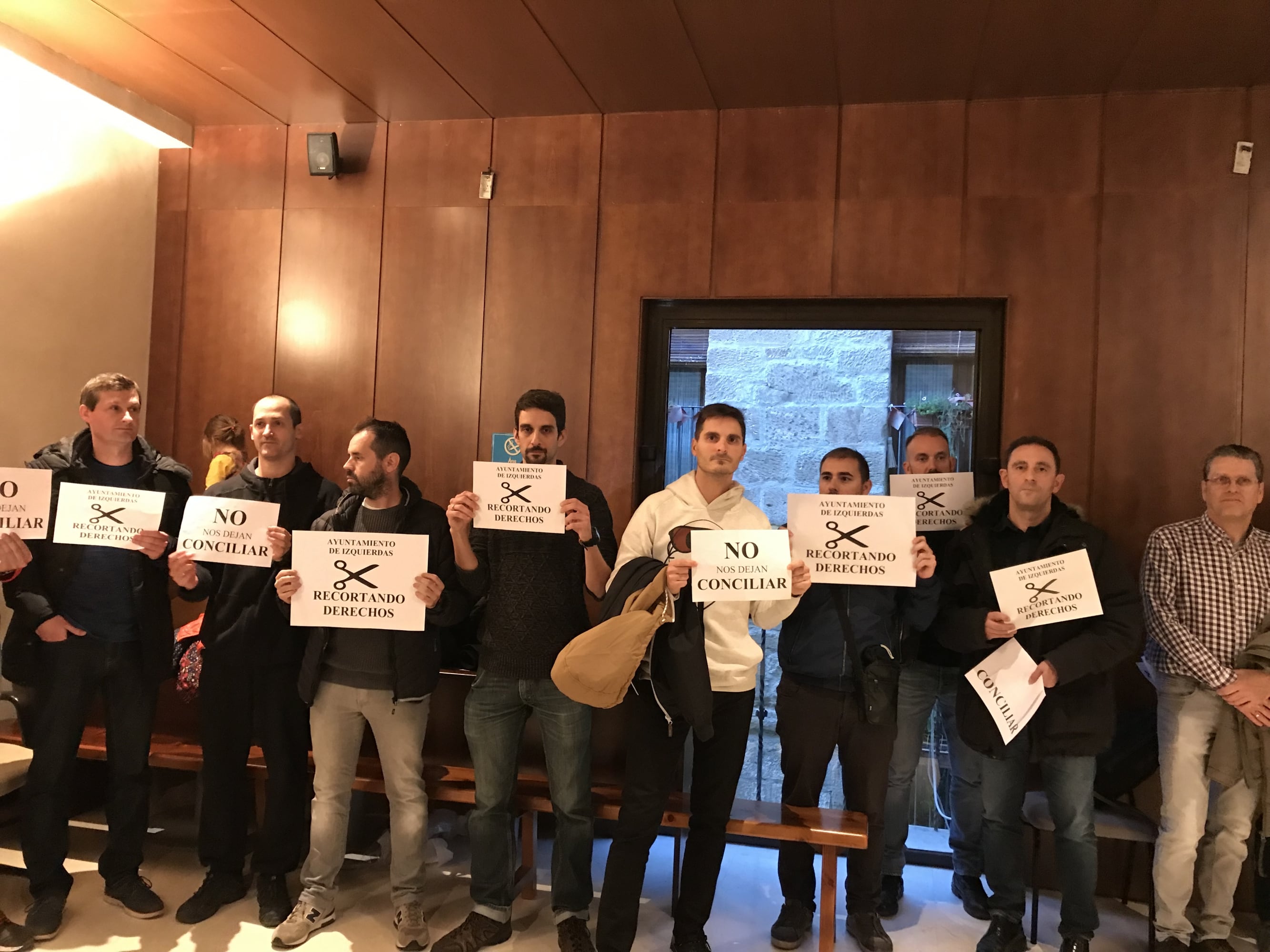 Este punto, que contaba con la aprobación unánime de todos los grupos, suponía que antes del inicio del pleno se congregasen a sus puertas una treintena de policías locales, bomberos y otros trabajadores municipales, portando carteles en los que podía leerse “No nos dejan conciliar” o “Recortando derechos”.