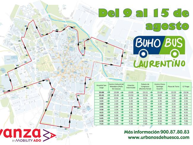 Nuevamente, el servicio de transporte urbano estará al servicio de los oscenses en las fiestas de San Lorenzo. Además de la línea diurna, el Búho-Bus Laurentino permanecerá por la ciudad para facilitar los desplazamientos entre todos los barrios y los principales escenarios de las fiestas en el centro, además del Palacio de Congresos, plaza de toros, recinto ferial y demás zonas de interés.