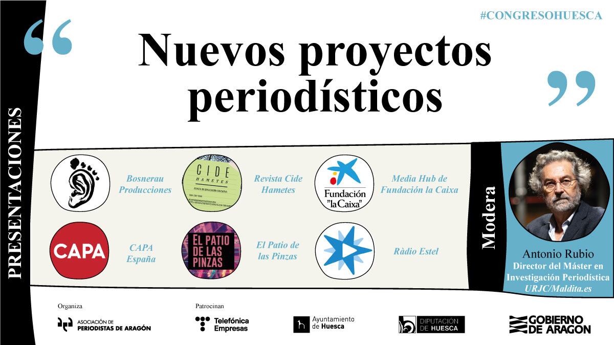 El XXIII Congreso de Periodismo de Huesca vuelve a convertirse en el escaparate de nuevos medios de comunicación el jueves 24 de marzo a partir de las 16.00 horas. Seis proyectos periodísticos como la Revista Cide Hametes, El Patio de las Pinzas, CAPA España, Media Hub de Fundación la Caixa, Ràdio Estel y Bosnerau Producciones tomarán la palabra en esta sesión moderada por Antonio Rubio, periodista, director del Máster en Investigación Periodística de la Universidad Rey Juan Carlos y la Fundación Maldita.es, y presidente de la Asociación de Periodistas de Investigación.