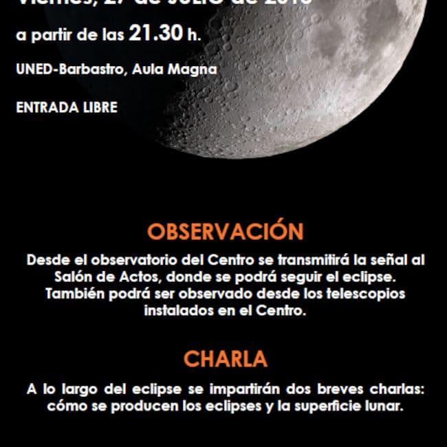 El eclipse lunar de este viernes podrá observarse desde el salón de actos de la UNED de Barbastro gracias a la retransmisión de la señal del observatorio del centro. Además, se instalarán telescopios en el centro para poder presenciar el eclipse de Luna más largo del siglo XXI.