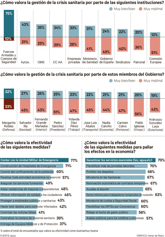 En cuanto a la efectividad de las medidas, el mayor respaldo se lo llevan la actuación de la Unidad Militar de Emergencias (UME), bien vista por un 77% de la gente, y la construcción de los hospitales de campaña (71%). El confinamiento y la paralización de la actividad son medidas que están bien valoradas por la amplia mayoría (60% y 57% respectivamente). Las que resultan menos contundentes son la entrega del material sanitario (aprobada solo por el 37% de los españoles) y la centralización de la compra de ese material (39%). Más indiferencia generan otras medidas, como la protección a los empleados o el aislamiento de las residencias de ancianos.