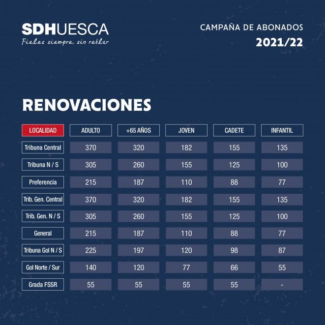 Bajo el lema “La vida es fútbol. El fútbol es vida”, la Sociedad Deportiva Huesca ha presentado la campaña de abonados de la temporada 2021/2022. En su regreso a Segunda División, el club tiene la esperanza de completar las 9.100 localidades que estarán disponibles entre renovaciones y nuevas altas desde hoy hasta el 8 de agosto, manteniendo varias condiciones y promociones a la vez que los precios se han visto aumentados en un 10%.