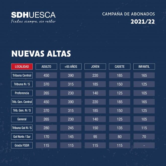 Para las nuevas altas se dará preferencia a accionistas y a miembros del Fan Club sin abono, pudiendo hacerlo desde el 26 de julio hasta el 8 de agosto. De esta forma, será posible hacerlo tanto de forma presencial en las oficinas como online a través de la web abonados.sdhuesca.es.