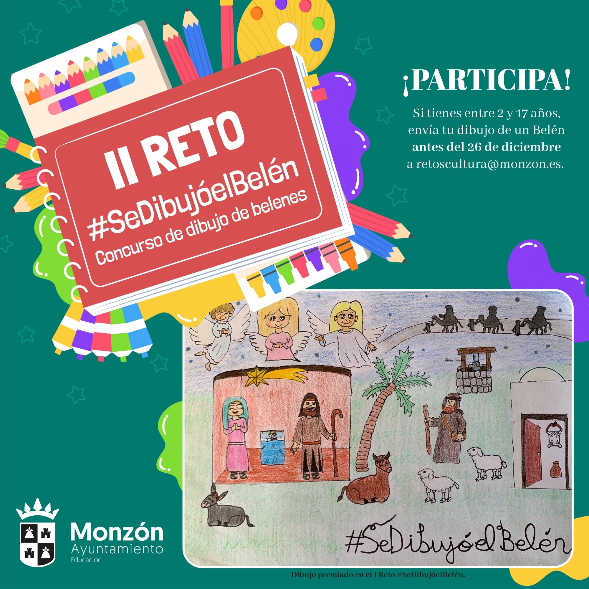 En cuatro categorías, de 2 a 6 años, de 7 a 12 años, de 13 a 17 años, y la de Alumnos del Colegio de Educación Especial La Alegría, los participantes deberán crear su propio dibujo y enviarlo escaneado, desde el 15 hasta el 26 de diciembre, al correo electrónico retoscultura@monzon.es. En el mail deberán incluir sus datos personales: nombre completo, edad, nombre del tutor, localidad, título del dibujo, categoría en la que participa, teléfono y mail de contacto.