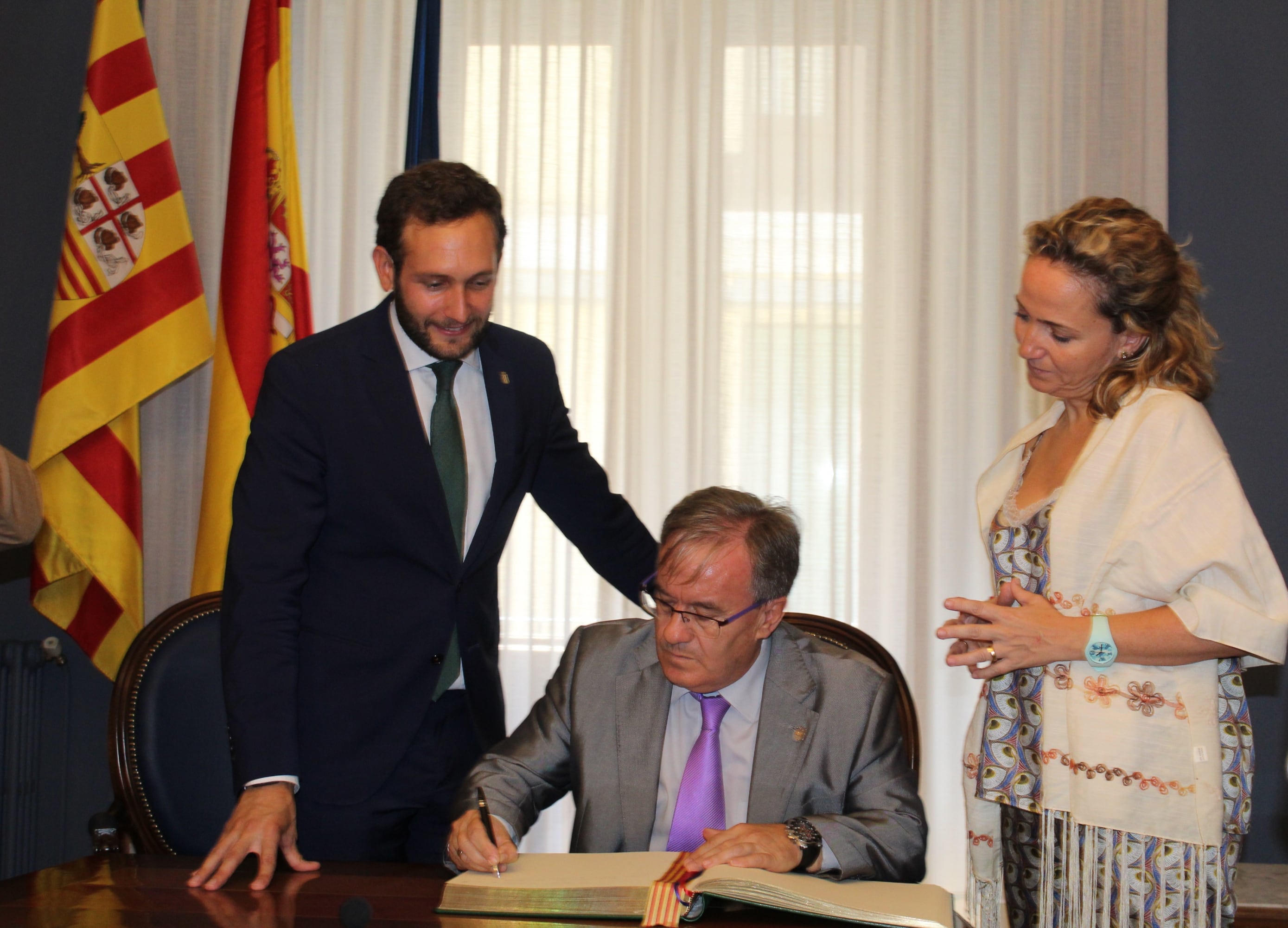 El justicia de Aragón, Ángel Dolado, acompañado por el lugarteniente de la institución, Javier Hernández, visitaba este jueves el Ayuntamiento de Monzón, donde era recibido por el alcalde, Isaac Claver, y firmaba en el Libro de Oro dejando constancia de su primera visita institucional al consistorio.