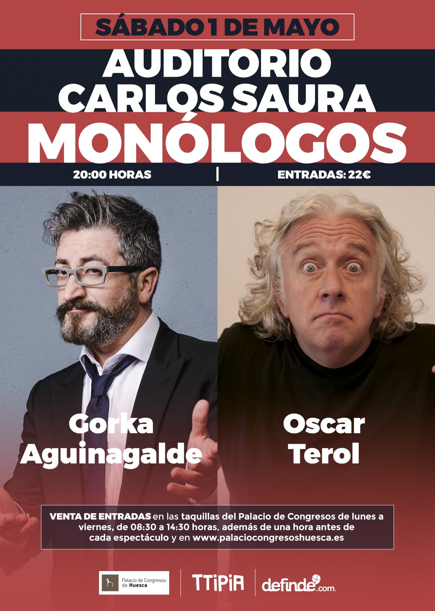 Óscar Terol y Gorka Aguinagalde visitarán el lunes 1 de mayo la ciudad de Huesca para ofrecer su espectáculo ‘Monólogos’, concretamente en el Auditorio Carlos Saura del Palacio de Congresos de Huesca a partir de las 20 horas. Como el propio nombre de la obra indica, se trata de dos monólogos distintos elaborados y expuestos por dos de los humoristas más reconocidos del territorio nacional, con los que pretenden “hacer pasar un rato de risas” al espectador.