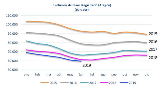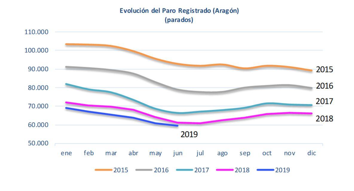 Según los datos publicados por el Servicio Público de Empleo Estatal, el paro registrado en Aragón durante el mes de junio de 2019 ha disminuido un 2,01% respecto a mayo, de manera que la Comunidad Autónoma contaba al finalizar el mes con 59.508 parados inscritos en las oficinas públicas de empleo, 1.223 personas menos que a finales de mayo. Con ello el paro registrado se situaba en Aragón por debajo de 60.000 personas por primera vez desde el mes de octubre de 2008. Desde julio de 2015, el paro registrado ha disminuido un 35,18%, al pasar de 91.804 a 59.508 personas.