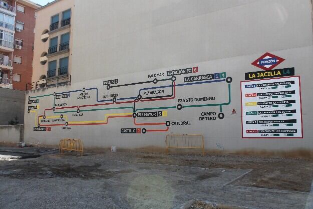 El primer ejemplo de la campaña “Makearte”, el Plan de Recuperación de Espacios Urbanos puesto en marcha desde la Concejalía de Urbanismo del Ayuntamiento de Monzón, se encuentra en el solar anejo a la residencia de ancianos Riosol, que desde hace unos días, luce el plano de una red de metro de seis estaciones.