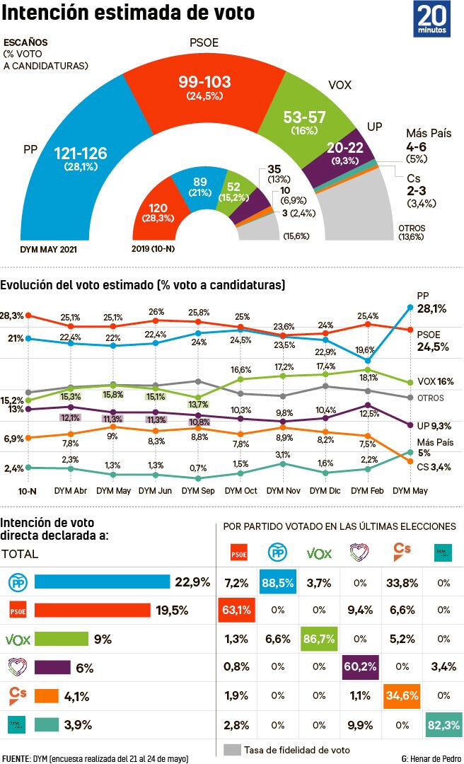 Sánchez caería a la segunda plaza: obtendría en torno a 100 escaños y el 24,5% de los votos. En tercera plaza, Vox frenaría su ascenso: registraría un 16% de las papeletas y 53-57 actas. Unidas Podemos, tras la marcha de Iglesias, se quedaría en una veintena de escaños y el 9,3% de los sufragios. Y en quinto lugar aparece Más País, que tras las elecciones del 4-M crecería del 2,2% al 5% y obtendría entre 4 y 6 escaños (ahora tiene 3). La candidatura que lidera Íñigo Errejón superaría a Ciudadanos, que sigue a la baja y sería sexto, con 2-3 diputados (3,4% de los votos).