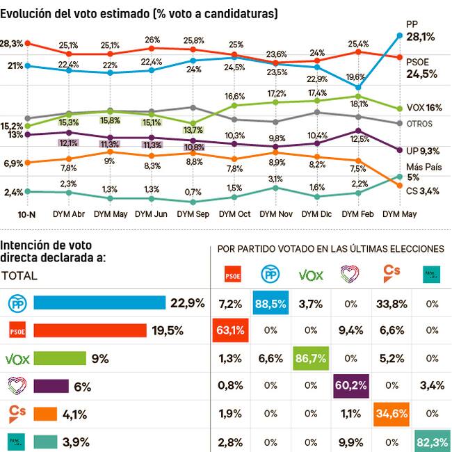 El PP supera al PSOE por primera vez y suma mayoría con Vox
