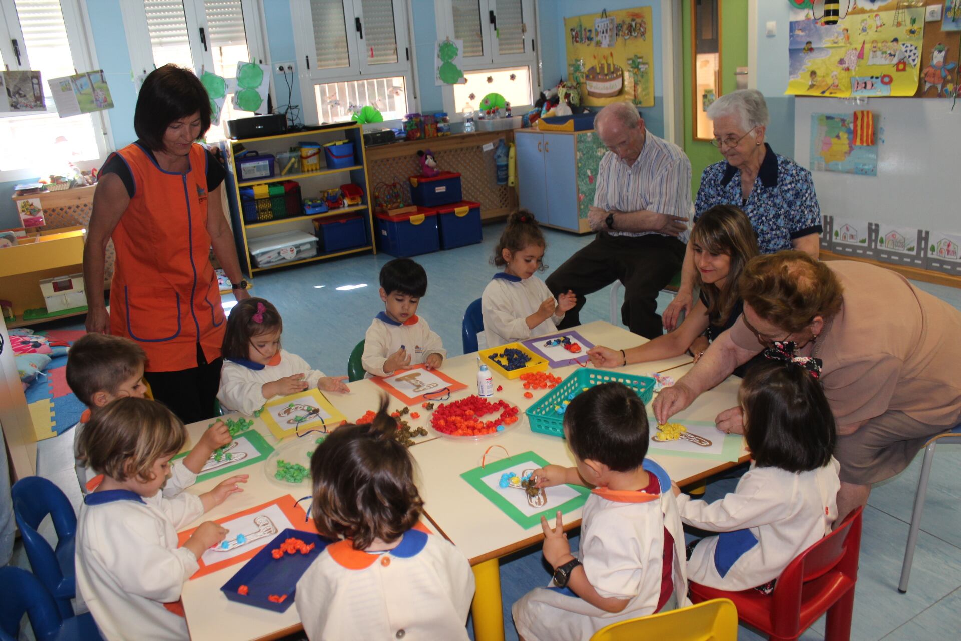 De este modo, con el objetivo de convivir con el alumnado y enriquecerles con sus conocimientos, residentes de la Residencia Monegros de Grañén se trasladan hasta el próximo viernes a las aulas de la Escuela Infantil Comarcal de Los Monegros ubicadas en Grañén, donde están matriculados niños y niñas de hasta 3 años de edad. “Conmuévete” comenzaba este lunes con la visita de Pilar, Severina y José, acompañados de la terapeuta ocupacional de la Residencia Monegros, Cristina Benavente para realizar unas manualidades en papel, que previamente habían aprendido a trabajar en la residencia. Los niños y niñas han seguido atentos sus indicaciones y han elaborado unas fantásticas manualidades.