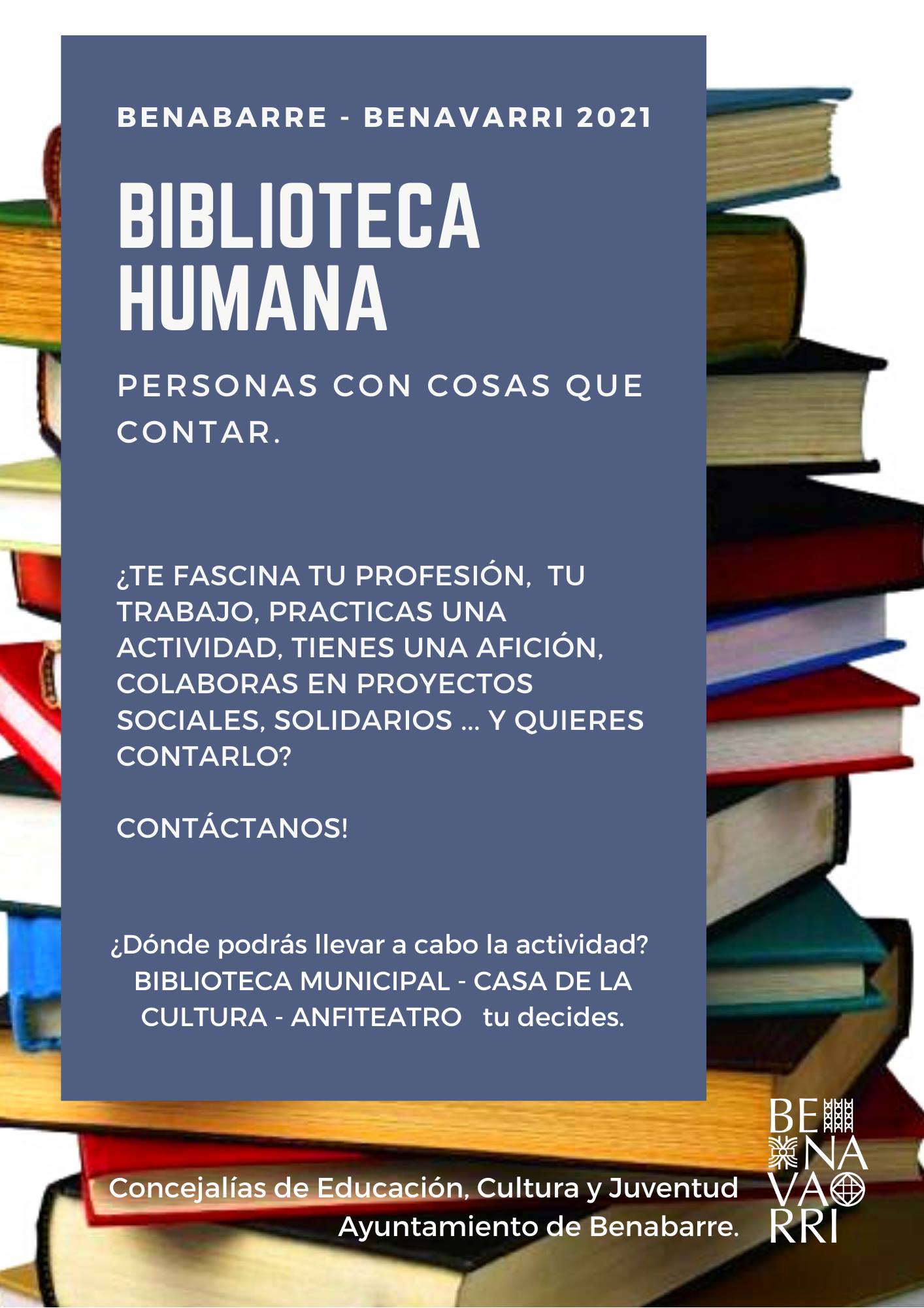 Las áreas de educación, cultura y juventud del Ayuntamiento de Benabarre impulsan un proyecto denominado ‘Biblioteca Humana. Personas con cosas que contar’ que pretende ofrecer un espacio a aquellas personas que quieran hacer partícipes, al resto de sus vecinos, de cosas que tengan que ver con su profesión, trabajo, afición o proyectos culturales, sociales o solidarios con los que colabore. El primero en participar en estos ‘encuentros públicos’ será Jorge Pueyo, que, este sábado, a las 18h, en el anfiteatro, dará a conocer su labor como divulgador del aragonés.