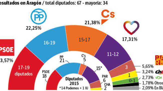 Eso implicaría que PSOE, Podemos y CHA tendrían dificultades para reeditar el acuerdo de investidura de 2015, aunque los socialistas podrían intentar pactar con Ciudadanos e incluso proponer acuerdos de gobernabilidad entre ambas formaciones para el conjunto de la Comunidad Autónoma.