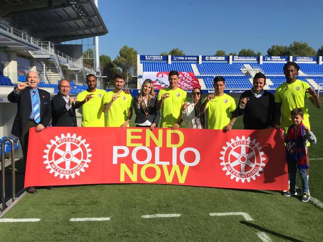 A su vez, la Sociedad Deportiva Huesca, tambiénse implicaba y eran varios jugadores los que los acompañaban en la visita y accedían a posar con el lema "End Polio Now", señalando que ya queda muy poco para erradicar la enfermedad".