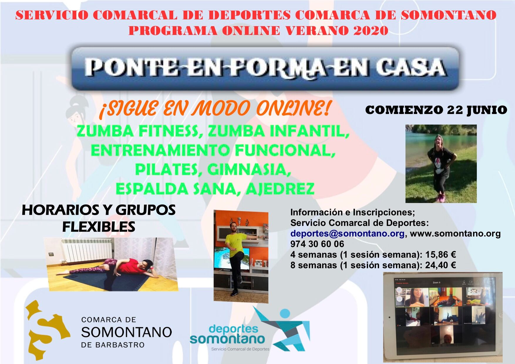 El Servicio de Deportes de la Comarca de Somontano de Barbastro pone en marcha el programa de deporte online verano 2020, con el lema "Ponte en forma en casa", que incluye propuesta de varios cursos, que comenzarán a partir del 22 de junio. La oferta incluye las siguientes propuestas deportivas: pilates, gimnasia de mantenimiento, entrenamiento funcional, zumba fitness, zumba infantil, espalda sana, ajedrez infantil.