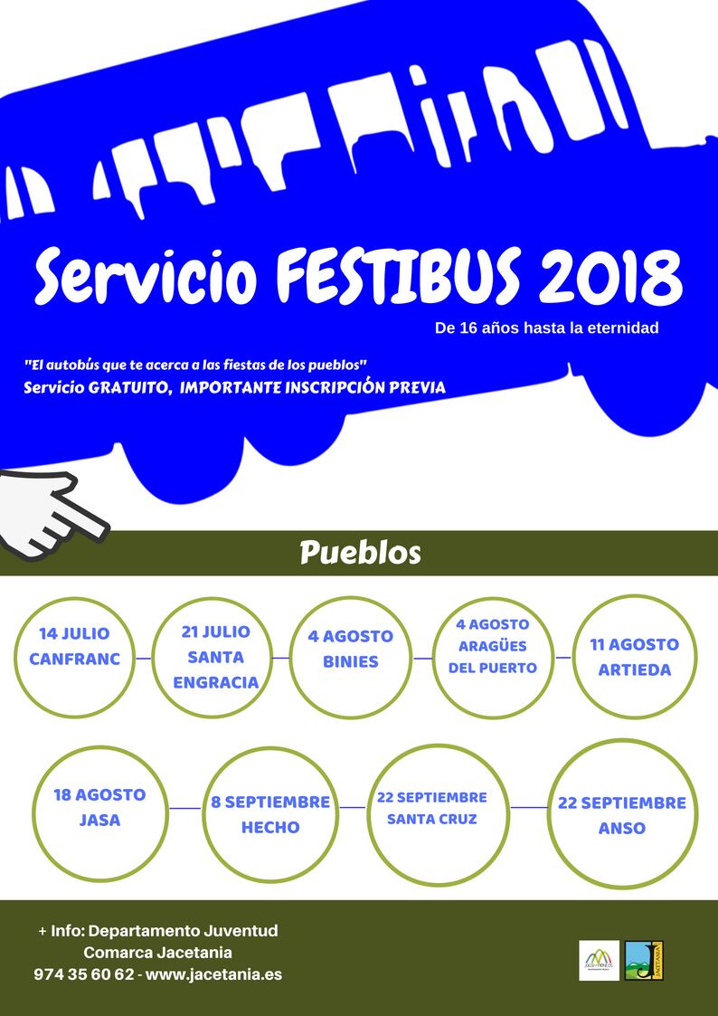 La comarca de la Jacetania pone un año más el servicio del Festibús, que este año ha aumentado el número de municipios participantes Este servicio consiste en un autobús gratuito, pero con previa inscripción, para que los más jóvenes dejen el coche en casa durante las fiestas de los pueblos de la Comarca de la Jacetania. De esta manera, la comarca y los ayuntamientos hacen evidente su compromiso con los más jóvenes. Canfranc será la primera localidad donde se pondrá en marcha el Festibus