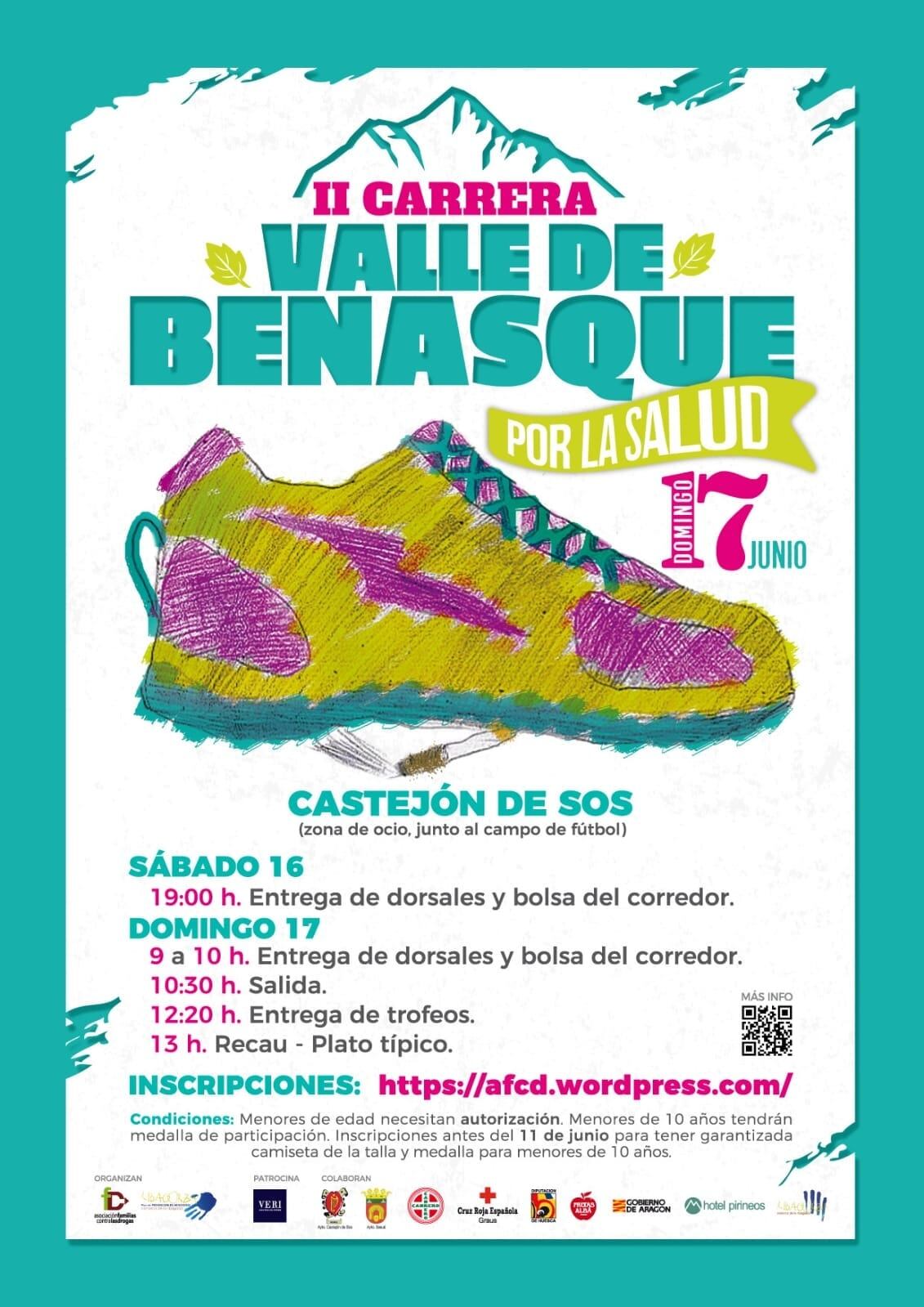 La Asociación de Familias contra las Drogas organiza este domingo la II Carrera Valle de Benasque por la Salud enmarcada dentro del Plan Comarcal de Prevención de Adicciones. Las inscripciones, cuyo coste es de 10 euros, finalizarán el sábado o al completar el cupo de las 200 plazas disponibles. Se pueden realizar a través de la web www.avaibooksports.com, en los Ayuntamientos de Castejón de Sos, y Sesué y en la Oficina de Turismo de Benasque. Este año la carrera se celebra en Castejón de Sos y el objetivo es superar los 155 participantes del año pasado.