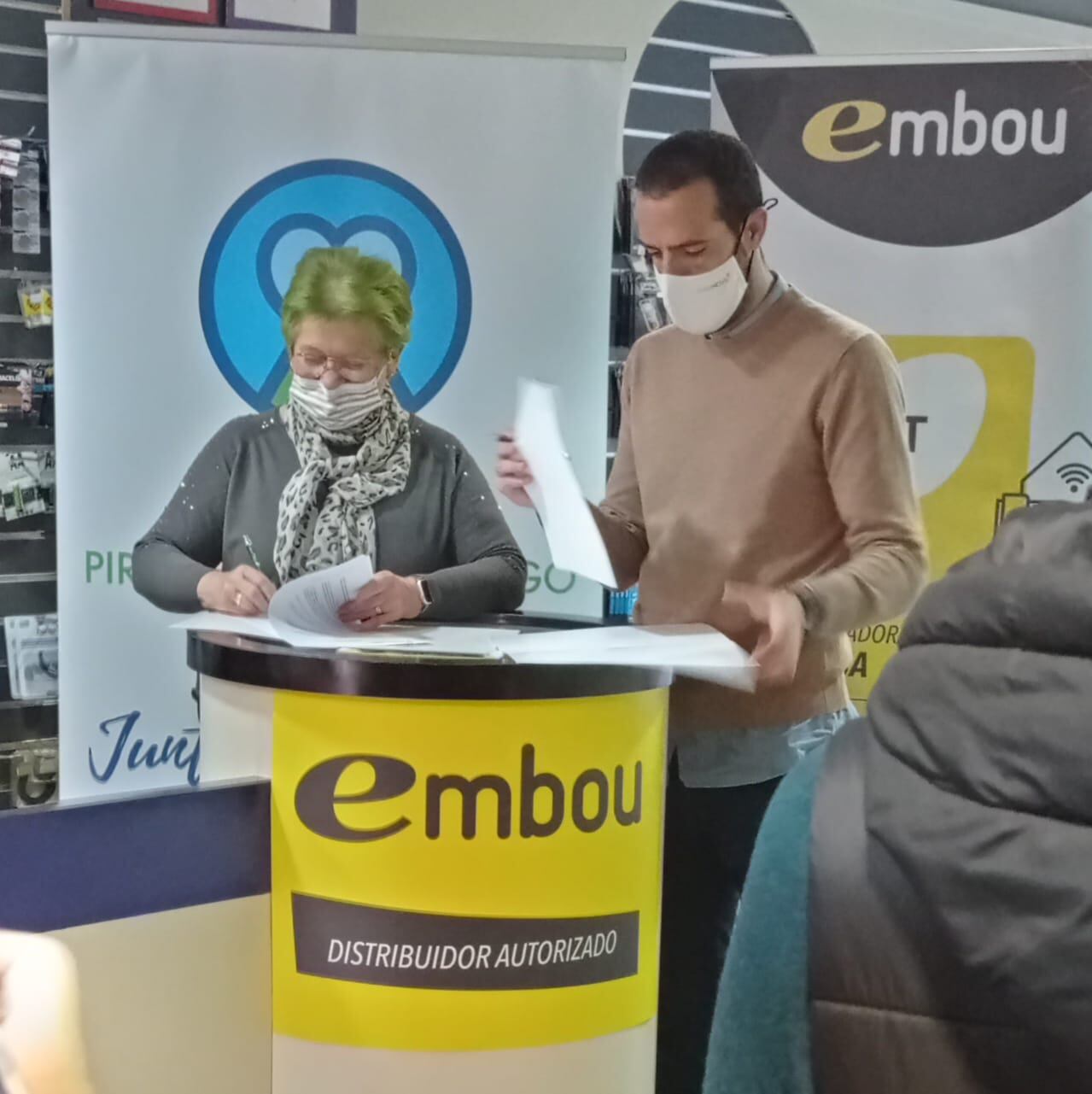 A dicha firma asistían en representación de Embou: Carlos Gimeno, jefe de Departamento de Desarrollo de Negocio; Etien Aldea, director de Marketing y Comunicación; y Guzman Barrio, propietario del Punto de Venta autorizado Foto Barrio. En representación de AEPAG fueron Carolina Briggs, presidenta de la Asociación de Empresarios y Lidia Ferrer, gerente de la misma.