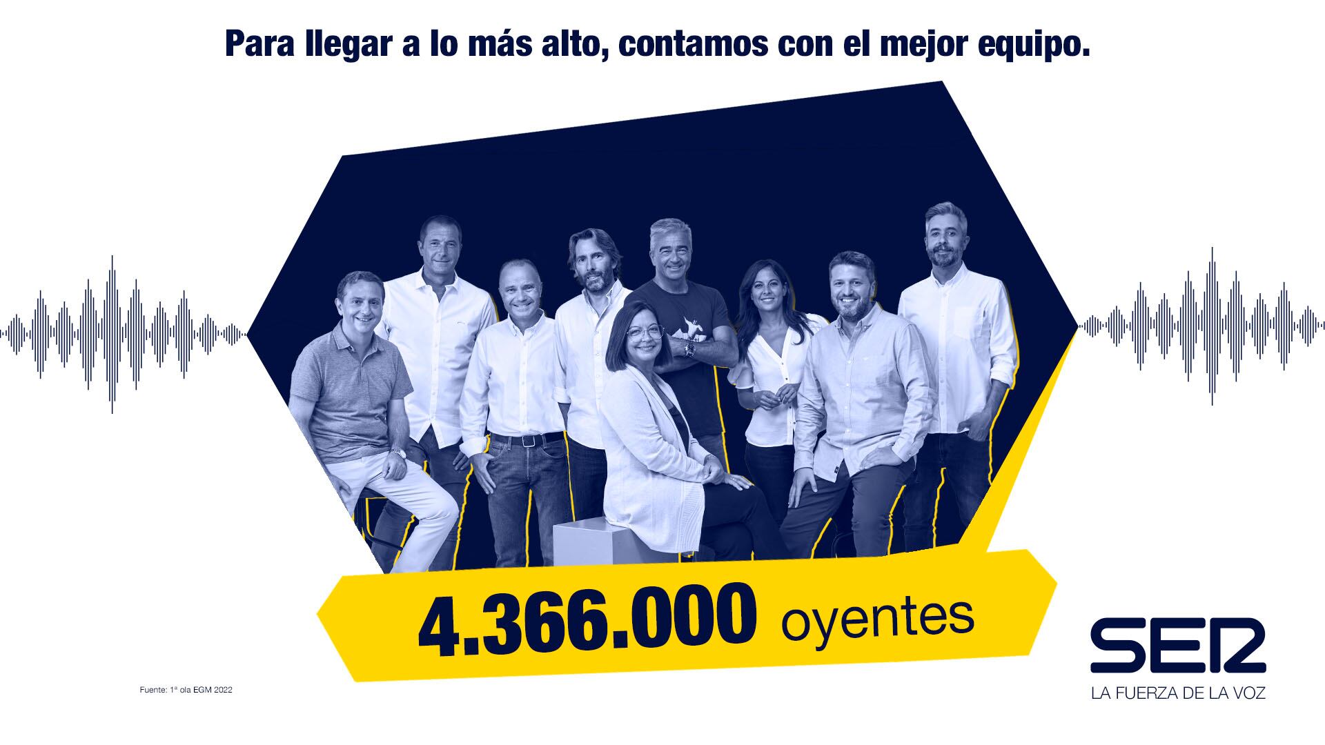 Según la 1ª ola del EGM 2022, la Cadena SER refuerza su liderazgo y registra 4.366.000 oyentes. La SER sube casi 300.000 oyentes, respecto a la ola anterior, y se coloca a 723.000 oyentes de ventaja sobre COPE y a 2.403.000 sobre Onda Cero.