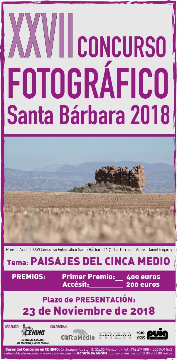 Cehimo convoca la entrega de premios de su XXVII Concurso Fotográfico Santa Bárbara 2018, con la que se inaugura la exposición de todos los trabajos presentados. El acto tendrá lugar este martes, 11 de diciembre, a las 20h, en la Sala Cerbuna de la Casa de la Cultura.