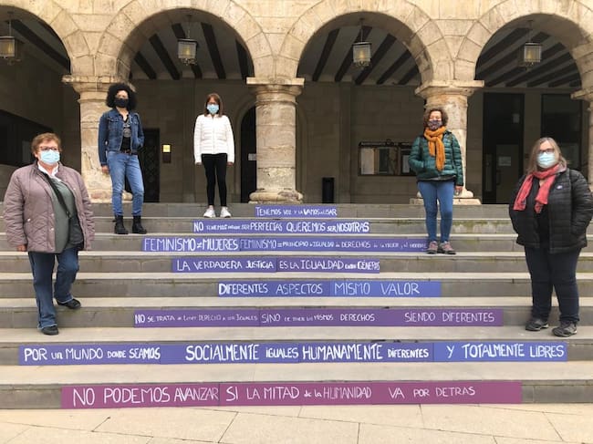 Este sábado, en el marco de los prolegómenos al Día Internacional por la Mujer, varias representantes del colectivo pegaban dichos carteles en los escalones de la plaza Mayor para que permanezcan ahí durante toda la semana.