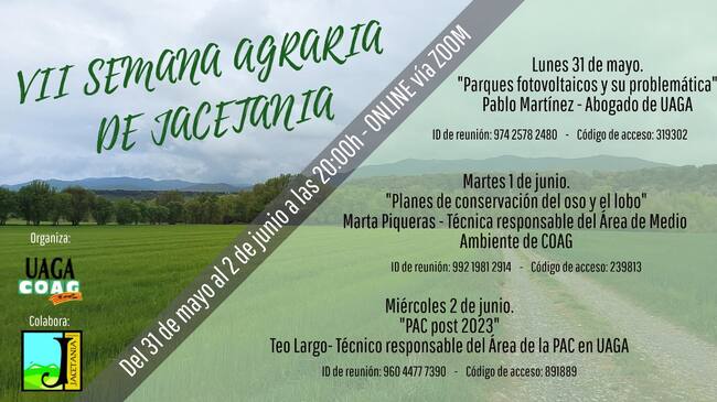 Dentro de los actos de la 32 edición de la feria Expogorga,, este lunes comienza la VII edición de la semana agraria de la Jacetania, que organiza el sindicato UAGA. , donde se analizarán tres temas que están muy de actualidad en la zona, los parques fotovoltaicos , los planes de conservación del oso y el lobo, así como la futura PAC . De igual forma se entregarán los premios Biodeiversidad por parte de UPRA y Oviaragón Grupo pastores,