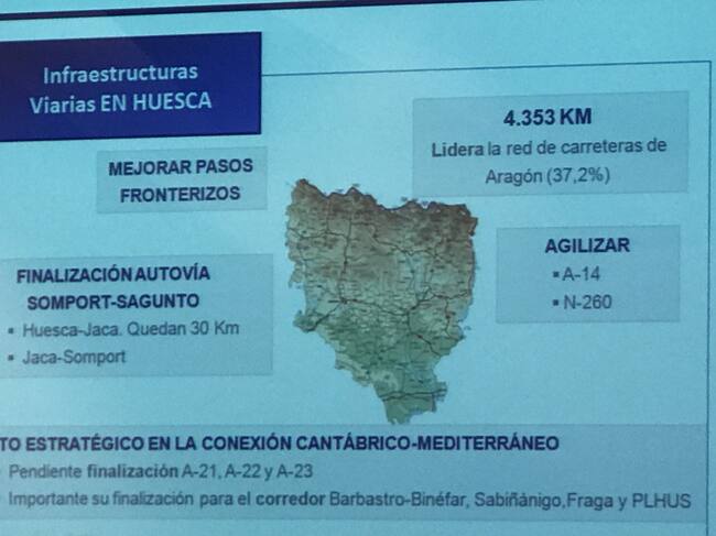 En infraestructuras carreteras, el presidente de CEOE Aragón enumeraba como casos sangrantes todos los que están pendientes de finalizar en Aragón: el desdoblamiento de la N-232, la A-68, y la N-II entre Zaragoza y Fraga. También lamentaba que están sin finalizar las autovías A-21, A-22 y A-23.
