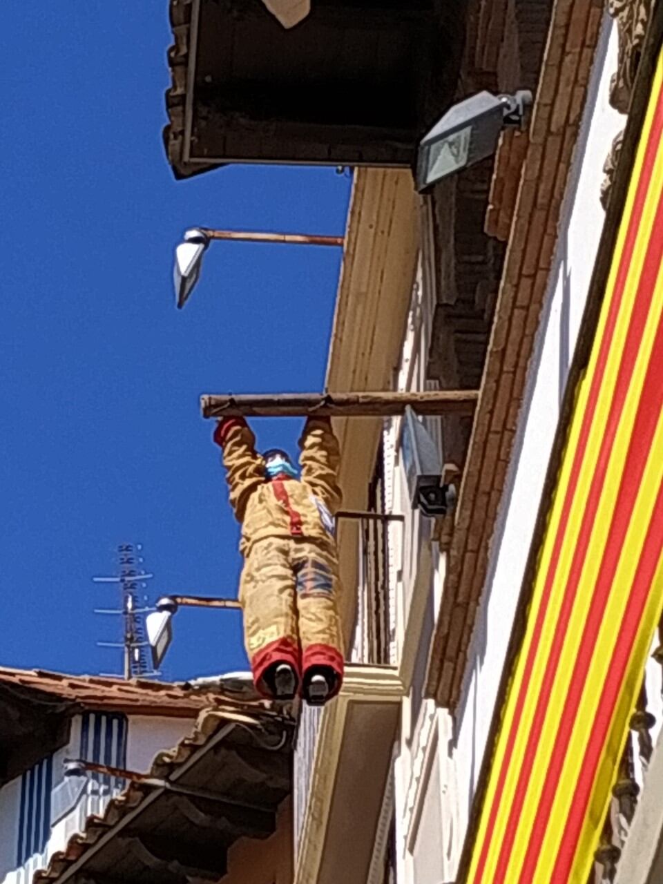 El único de los símbolos que va a recordar, a vecinos y visitantes, que son días especiales, es Furtaperas que, portando también mascarilla, ocupa ya su lugar en la fachada del Ayuntamiento para ser testigo mudo, este año, de lo que acontezca en una plaza que no será el epicentro de la fiesta.