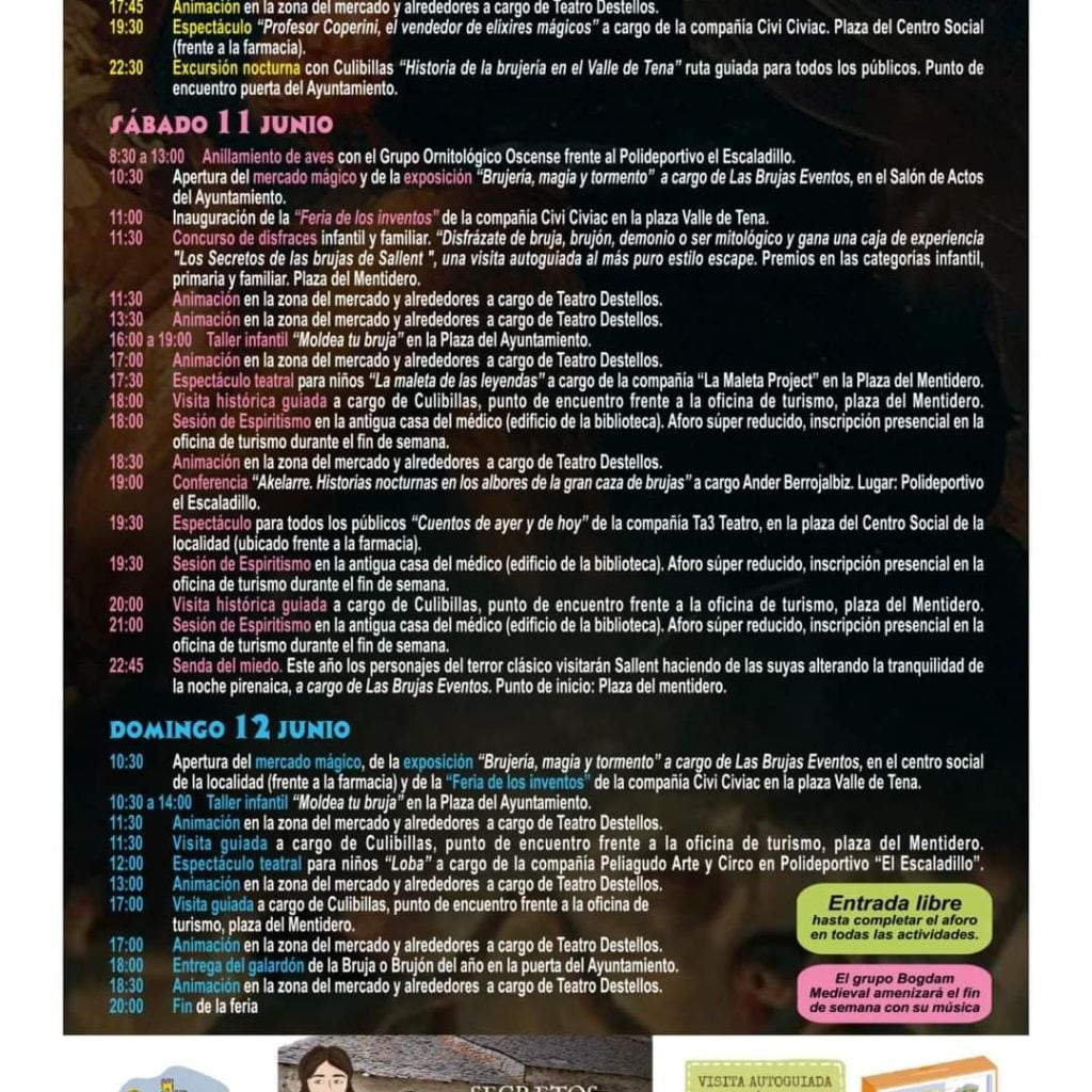 Este fin de semana llega cargada de misterio, magia y esoterismo, con la celebración de la X Feria de Brujas, Mitos y Leyendas del Valle de Tena en Sallent de Gállego. Tres jornadas, del 10 al 12 de junio, en las que se podrá encontrar actividades para todos: Mercado artesanal, actividades infantiles, charlas y conferencias, talleres, teatro de calle, visitas guiadas, música o la entrega del Galardón de la Bruja o Brujo del Año, entre otras muchas.