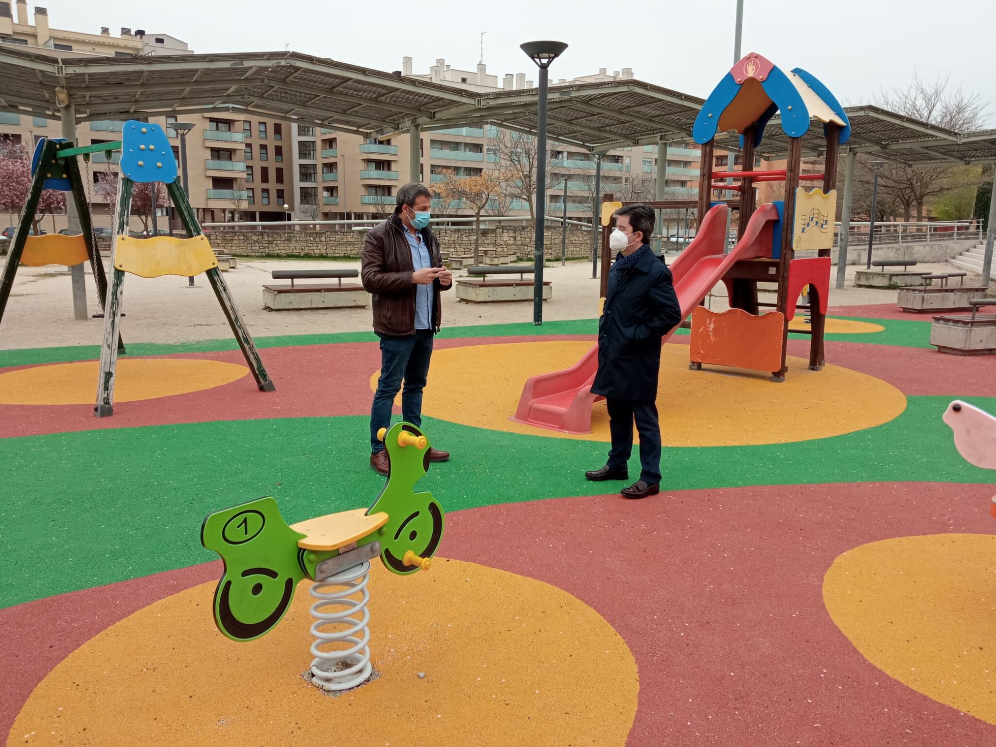 El alcalde de Huesca, Luis Felipe, y el concejal de Servicios Generales, Roberto Cacho; han visitado algunas de las zonas en las que se han sustituido las losetas existentes por caucho continuo. En concreto se ha actuado en los parques de La Manzana (en la imagen), Zacarías Martínez, Bellestar de Flumen y en los colegios Pirineos-Pyrinees y San Vicente.