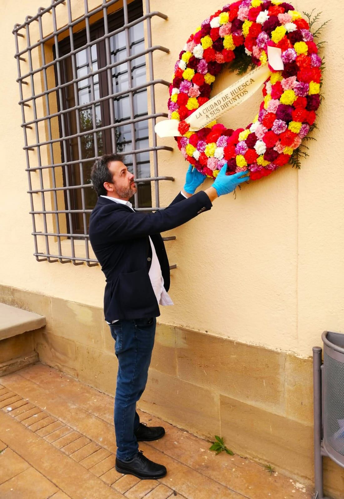 El Ayuntamiento de Huesca ha colocado en la entrada del Cementerio Municipal una corona de flores en recuerdo de todas las personas fallecidas por coronavirus. La corona ha sido colocada, en nombre de toda la Corporación Municipal, por el concejal de Servicios Generales, Roberto Cacho.