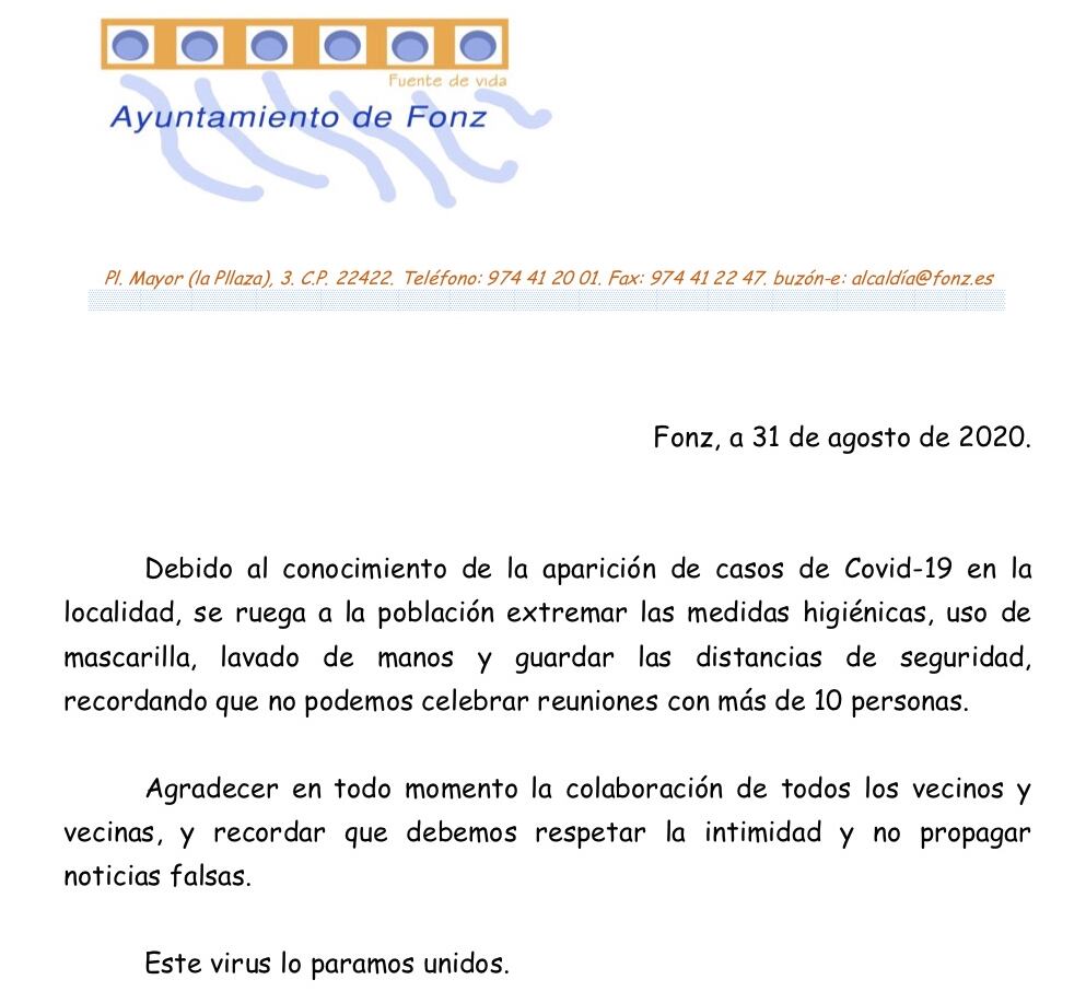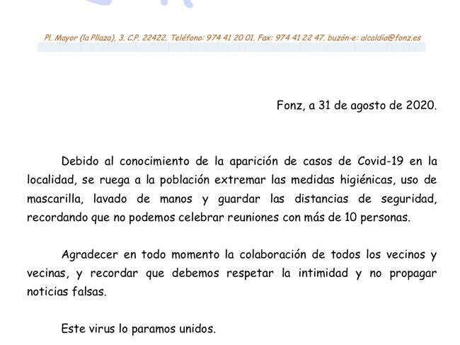 Ante la aparición de casos de covid-19 en Fonz, el Ayuntamiento de la villa mediocinqueña ha hecho público un bando mediante el que insta a sus vecinos al uso de la mascarilla y a la adopción de las medidas de seguridad recomendadas por las autoridades sanitarias para evitar la propagación del coronavirus.