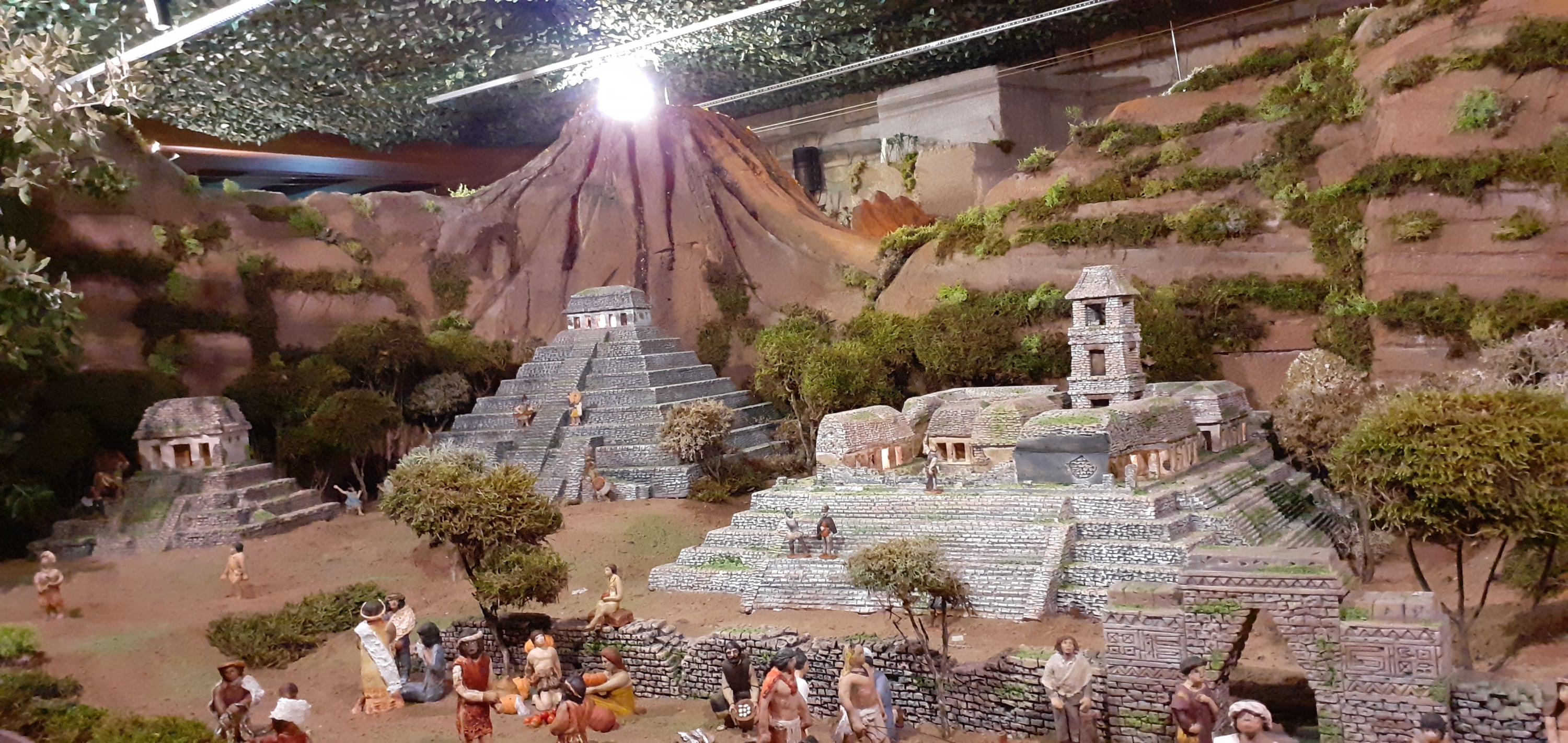 Pero no solo se han limitado al diorama, han decorado y ambientado toda la sala de exposiciones de Casa Cabrera, local que cada año alberga este espectacular Belén. Junglas tropicales, columnas de piedra de pirámides aztecas, lianas que se descuelgan del techo y paredes e incluso un volcán conforman el entorno que acompaña a las figuras de este año recreando varias épocas y lugares de ultramar.