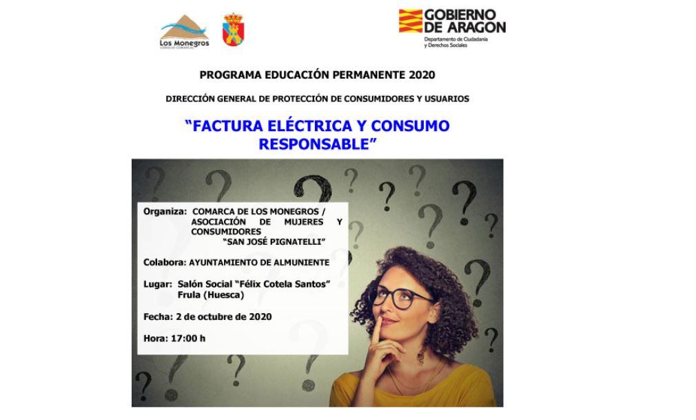 La próxima charla sobre “Factura eléctrica y consumo responsable” en Los Monegros tendrá lugar este viernes, 2 de octubre, a las 17 horas y está organizada por la Oficina Comarcal de Consumo de la Comarca de Los Monegros (OCIC Monegros) y la Asociación de Mujeres y Consumidores “San José de Pignatelli” de Frula, junto a la Dirección General de Protección de Consumidores y Usuarios del Gobierno de Aragón, con la colaboración del Ayuntamiento de Almuniente. Supone el arranque de la nueva temporada informativa de otoño de la O.C.I.C. Monegros.